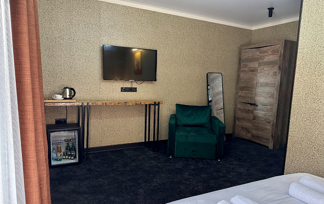 Корпус ”Новый”В номере: двуспальная кровать, кондиционер, мини-бар, телевизор, санузел с душем, фен.